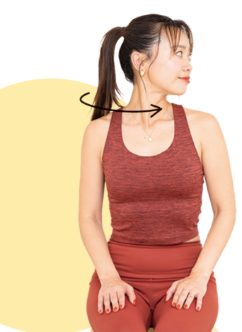 まずは首のこり具合をチェック。肩を正面に向け、後ろを見てください。どこまで首が回るか覚えておきましょう。