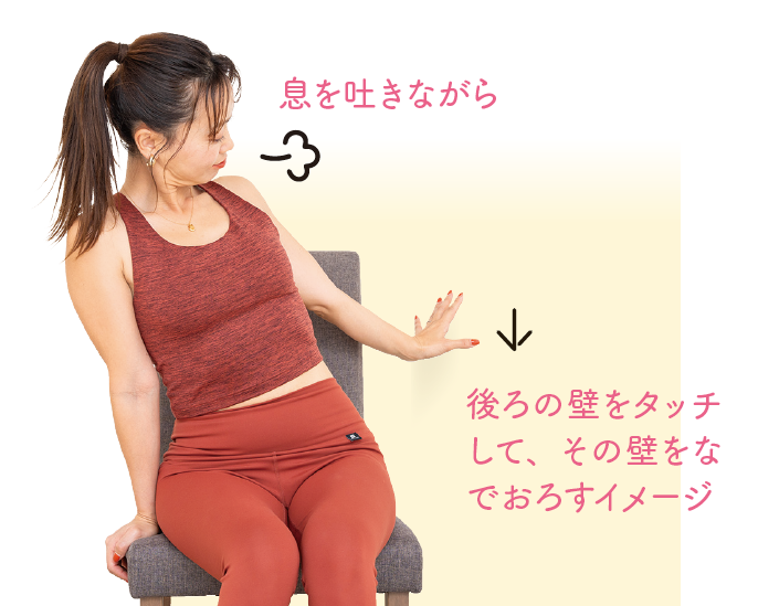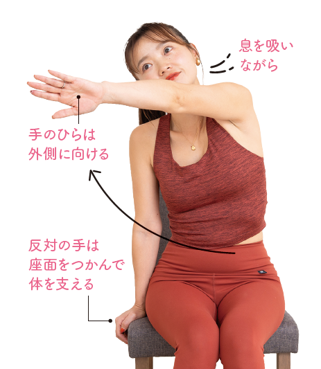 イスに座り、片方の腕を伸ばし下から上へ回し上げます。