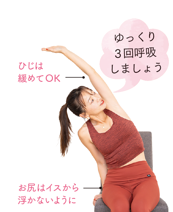 ❶~❸を3回繰り返し、4回目に腕を上げたら、体側を伸ばして深呼吸をしましょう。